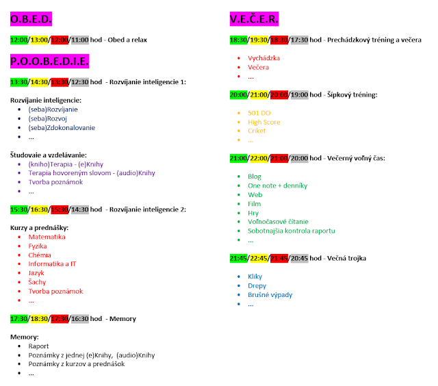 Ahoj Tak opäť sa hlásim v TM. Čo je nové? Jelikož nám pribúdajú pohybové, spoločenské obmedzenia, kvôli "korona vírus", mi pribudli pohybové aktivity. Tak napríklad na každý druhý deň Som si zvolil (seba)zdokolovanie tela. Pribudla samovýkuka, trénig, či terapia s karate, tanca a posilňovna. Totiž je za potreby striedať, vyvažovať rozvíjanie inteligencie hlava interakcia telo. Ak bude možné dám sa aj na bycikel, či beh. Tento TM je názornou ukážkou toho, ako využiť svoj voľný čas a rozvíjať sa. Ak milí čitatelia sa nachádzate v období voľného času, ktorého je (ne)úrekom veľa, tak tento môj TM, môže byť pre vás inšpiráciou a motiváciou, ako si zostaviť vlastný. Ale (ne)odradzujte sa od (ne)ho, keď vám eGo, myseľ (ne)dovolí sa podľa neho riadiť a ovládať. To je normálne. Niekedy potrebuje aj nič (ne)robiť, len tak byť, robiť relax. Budete (ne)ustále TM prerábať a upravovať. To je tiež normálne. Plány a ciele majú tendenciu byť (ne)ustále upravované a pozmenené. Tak sa pripravte aj na to, že si svoj TM budete upravovať pravidelne. eGo a myseľ (ne)majú radi pravideľnosť, (ne)majú radi staré a známe veci. Radi objavujú nové a neznáme veci. Upravovanie TM, by malo po zvačša pozostávať s premiestnenia časov a aktivít, navzájom ich poprehadzovať, či pridať (ne)jakú novú aktivitu, koníček, hobby. odkazodkazodkazodkazodkaz