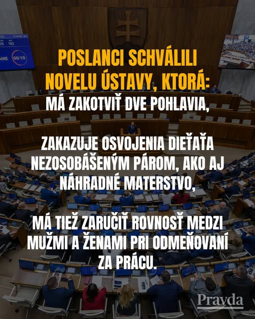 Poslanci NR SR schválili vládnu novelu Ústavy, ktorá zavádza pojem dvoch pohlaví – muž a žena – a zaručuje rovnosť pri odmeňovaní. Súčasťou návrhu boli aj úpravy adopcií či školského procesu. Prešla tesne – podporilo ju presne 90 poslancov, čo je minimálna hranica na zmenu ústavy. Robert Fico vyhlásil, že ak by novela neuspela, Smer by sa k tejto téme už viac nevracal. Proti sa ostro postavila opozícia aj Benátska komisia Rady Európy, ktorá varovala pred nejasnosťami a rizikom diskriminácie. Táto zmena tak prináša nielen zásadný zásah do základného zákona štátu, ale aj ďalšiu vlnu spoločenských sporov o kultúrno-etické otázky. odkaz
